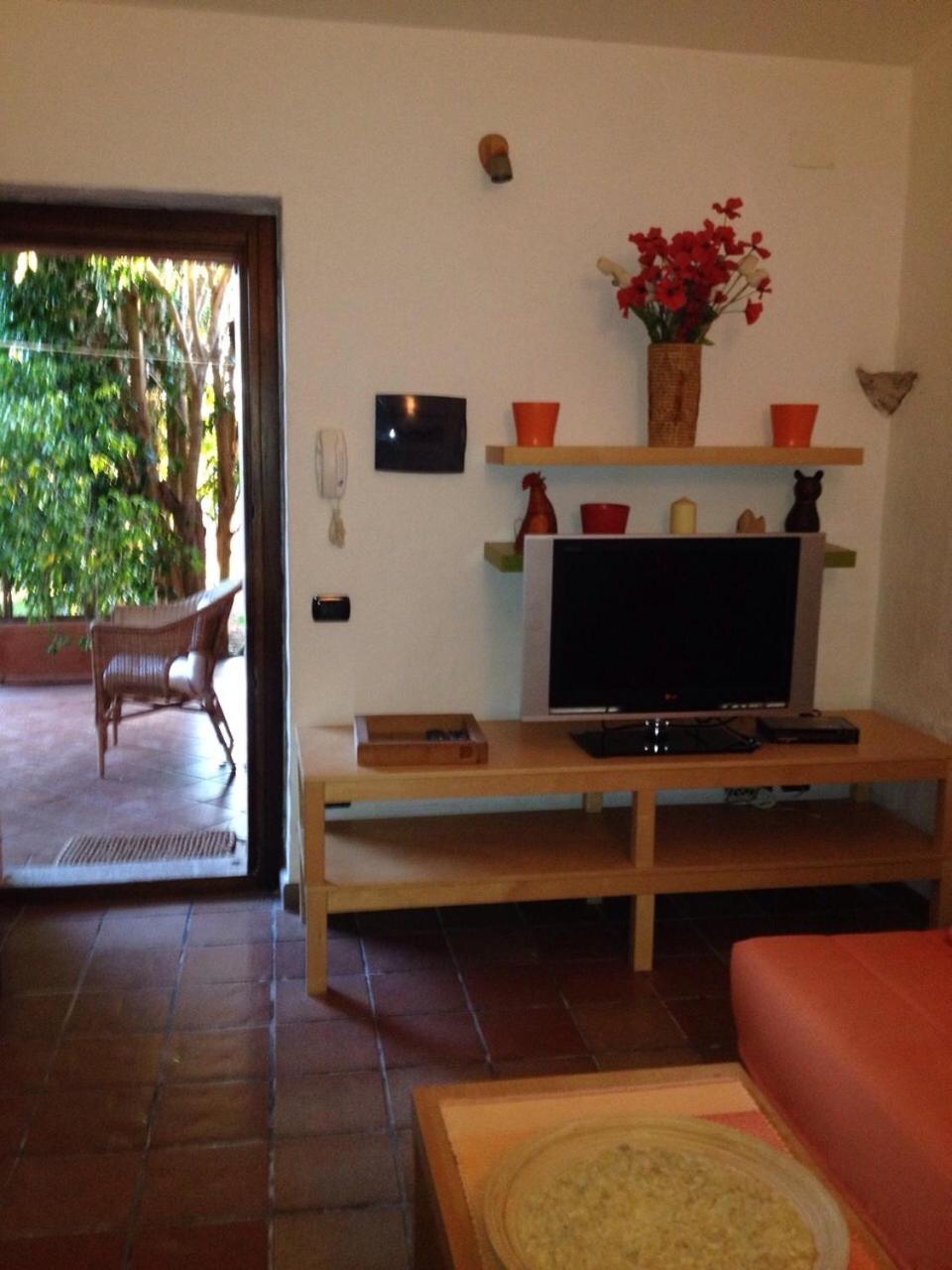 Monolocale con Vista Giardino. Set on one floor, ground floor, this one-bedroom apartment features a furnished patio and a living area with double sofa bed and kitchenette. It includes a washing machine, a flat-screen TV, air conditioned, and a bathroom with a shower. ;