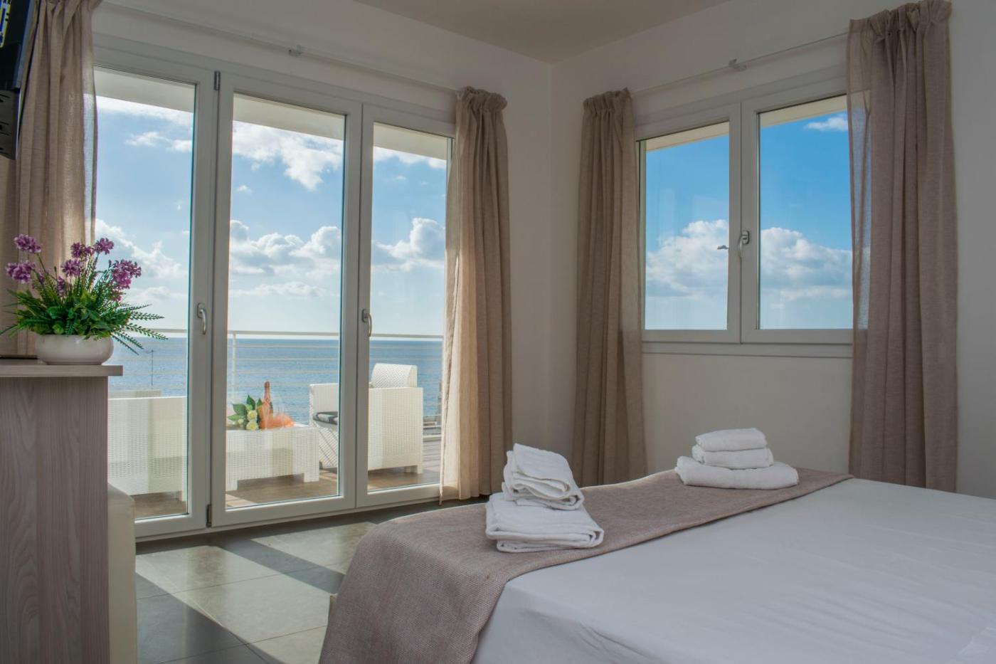 Camera Matrimoniale Deluxe con Terrazza Privata. Questa camera matrimoniale climatizzata è dotata di armadio, terrazza con vista sul mare, e bagno privato con doccia. L’alloggio dispone di 1 letto. ;