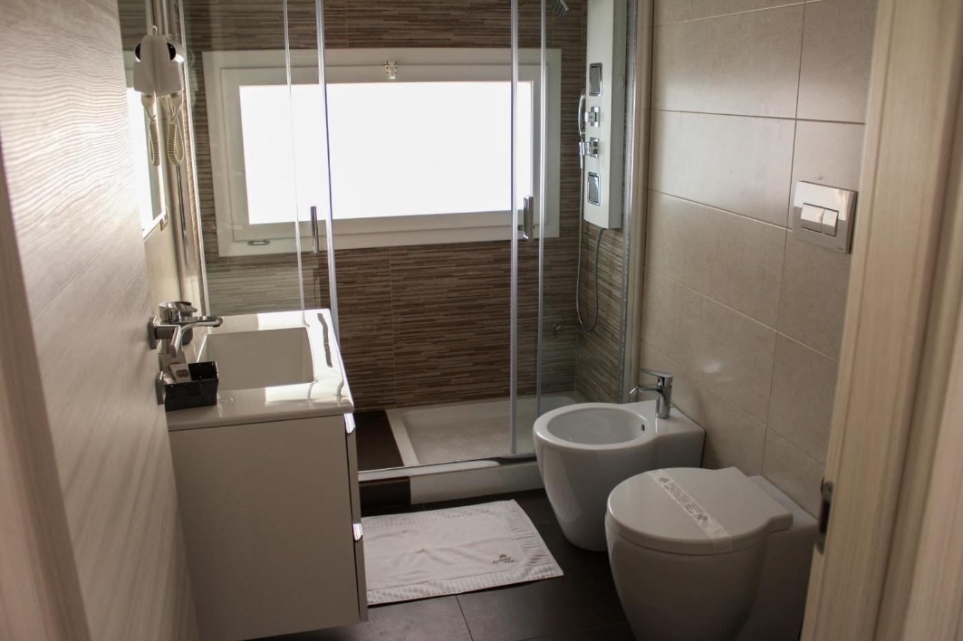 Ogni alloggio presenta un bagno privato con bidet, l’aria condizionata, una TV a schermo piatto e un frigorifero. Alcune unità presentano una terrazza eo un balcone con vista sul mare.