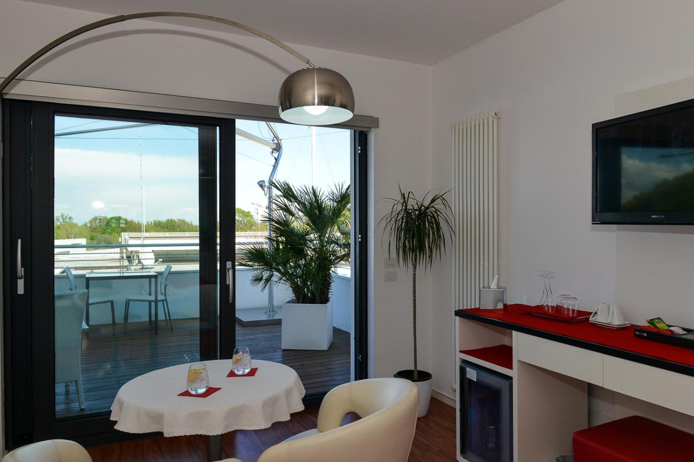 Junior Suite con Terrazza. Questa suite climatizzata include 1 camera da letto e 1 bagno con doccia e bidet. Suite con minibar,per la preparazione di tè e caffè, TV a schermo piatto e vinochampagne. L’alloggio presenta 1 letto. ;