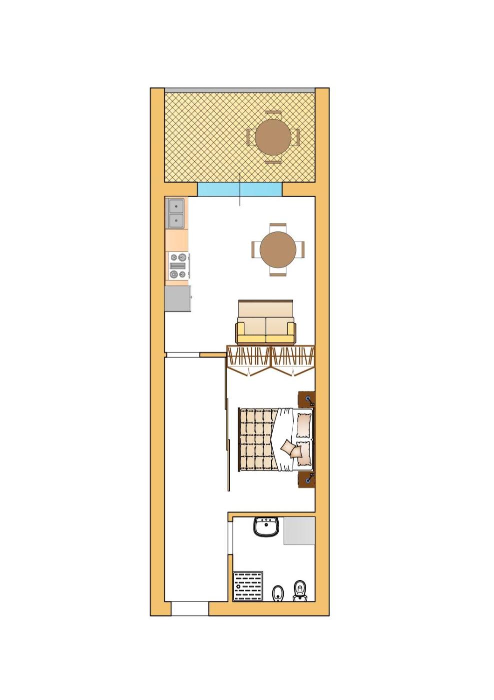 Appartamento - 1° Piano con Balcone. Appartamento climatizzato vista giardino, dotato di terrazza arredata, area salotto separata con divano-letto, TV a schermo piatto e angolo cottura con lavatrice. L’alloggio si trova al 1° piano. La spiaggia più vicina vi attende a 2 km. All’arrivo dovrete versare un deposito cauzionale di 100 EUR. L’importo vi sarà rimborsato al momento del check-out, previa verifica delle condizioni dell’alloggio.